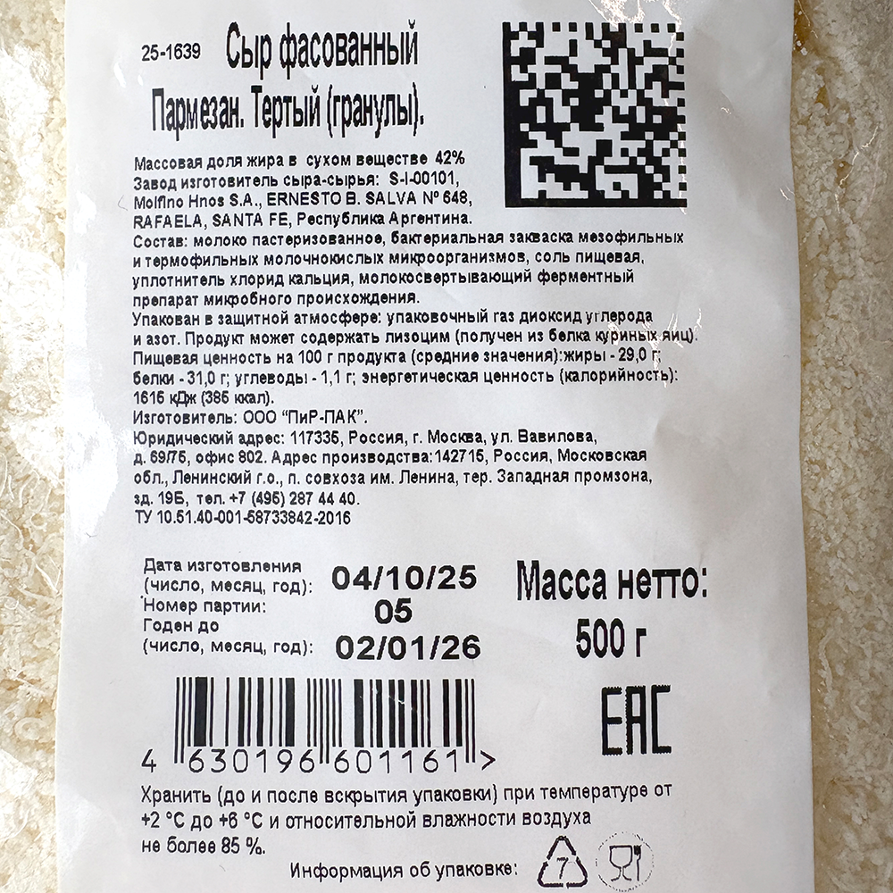 Сыр фасованный Пармезан ТМ Рикрем, тертый (гранулы) 42%