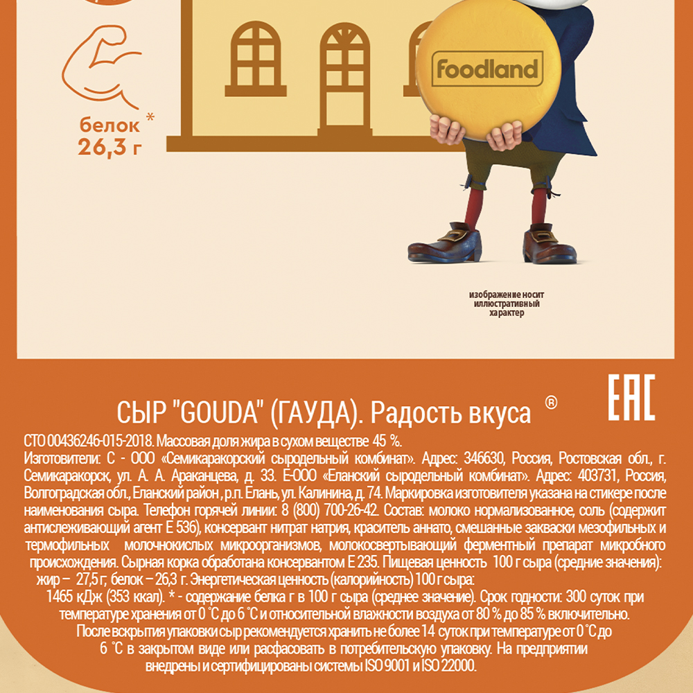 Гауда ТМ Радость вкуса - сыр с редким глазком и приятным сливочным вкусом.Сыр изготовлен из свежего молока, сырное тесто нежное, пластичное, однородное по всей массе.