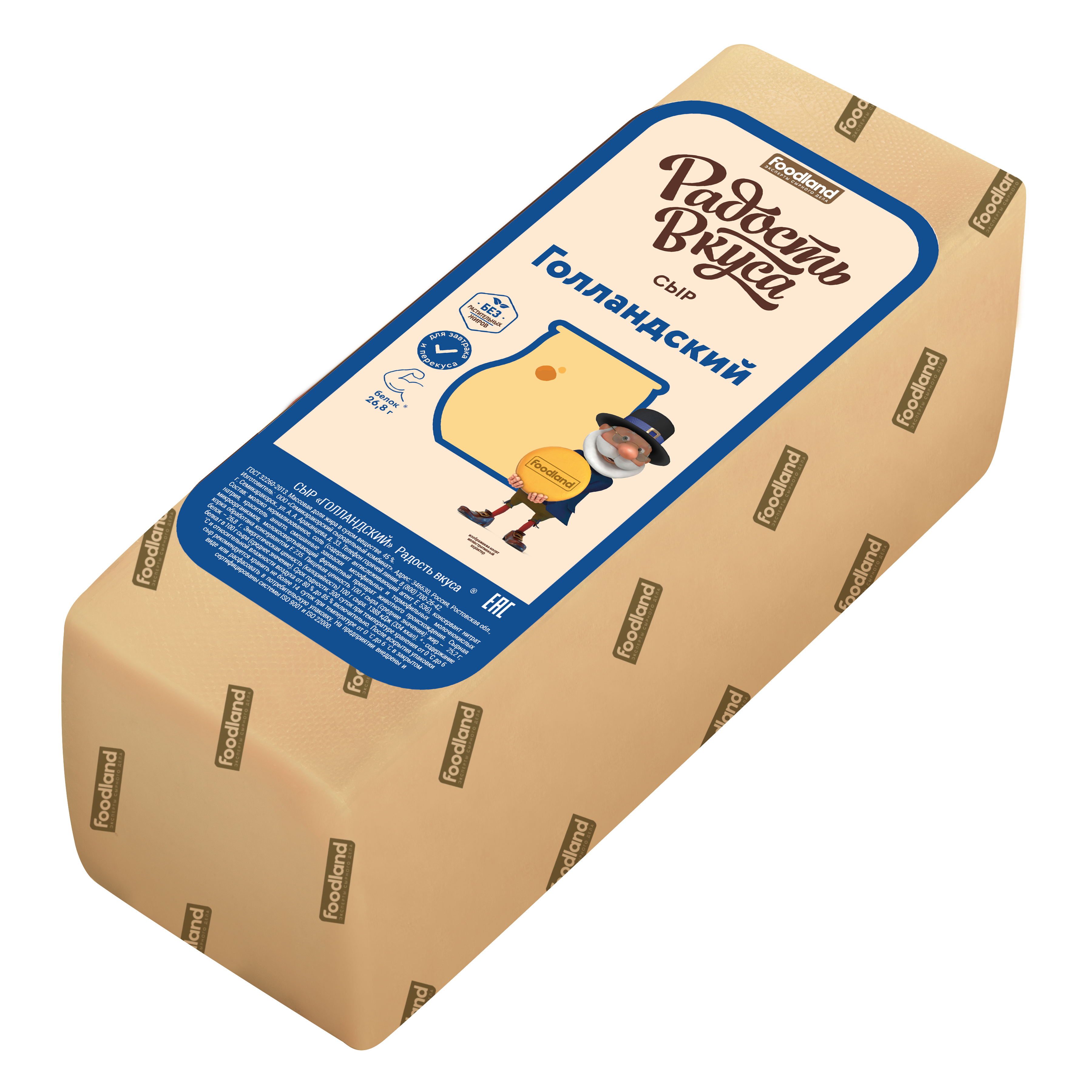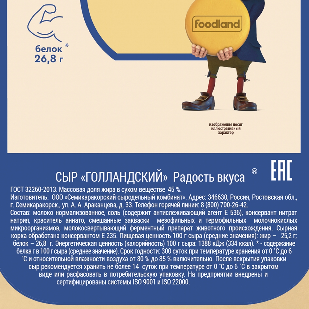 Голландский ТМ Радость вкуса – сыр с выразительным сырным вкусом, легкой кислинкой и ореховыми нотками. Структура сыра плотная, однородная, с редким глазком.Сыр изготовлен из свежего молока, подходит для приготовления холодных и горячих блюд.