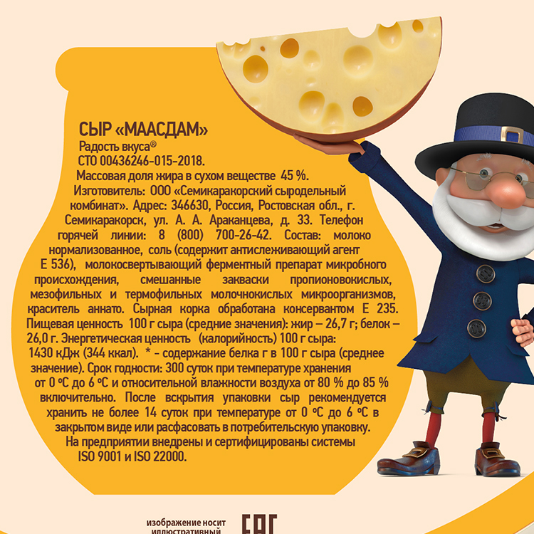 Маасдам - один из самых известных и любимых видов сыра во всем мире, родом из Голландии. Сыр славится своими крупными глазками на срезе, имеет сладковато-ореховый вкус.Маасдам идеально подходит для быстрого перекуса, сырной тарелки, приготовления бутербродов и канапе.