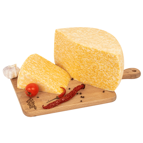Мраморный сыр ТМ Радость Вкуса изготавливается из коровьего молока и выделяется среди прочих сыров необычным рисунком на срезе. Красивые разводы белого и оранжевого цвета изысканно переплетаются, напоминая мраморную текстуру.Сыр имеет нежный сладковатый вкус со сливочными нотками.