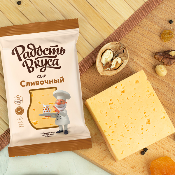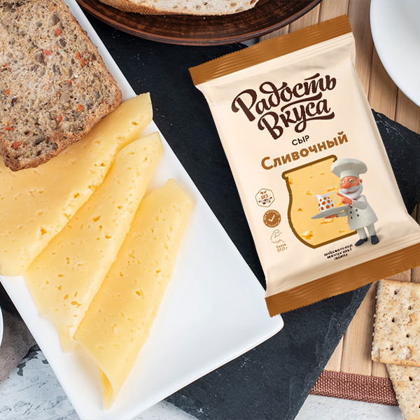 Сыр Сливочный ТМ Радость Вкуса имеет мелкий резной глазок и нежный сливочный вкус. Подходит для бутербродов и приготовления различных блюд. Раскрывает свой вкус в сочетании с фруктами и медом.Свежий багет в сочетании с сыром Сливочный станет вашим любимым перекусом!