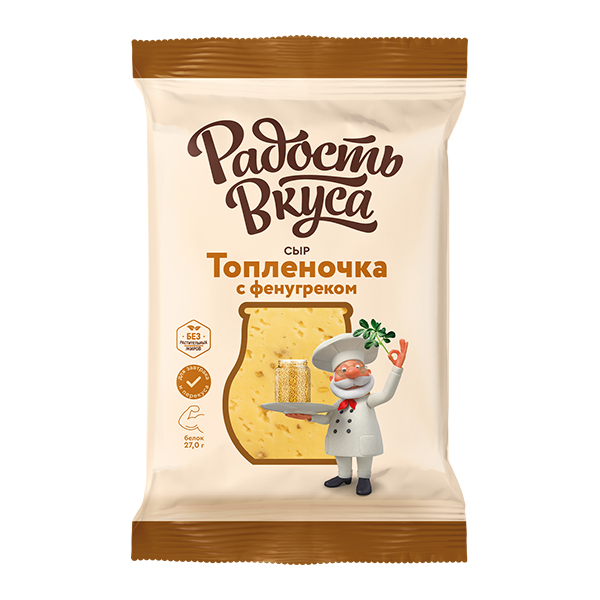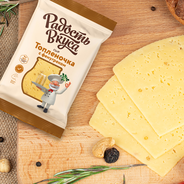 Сыр "Топленочка с фенугреком" ТМ Радость Вкуса- это уникальный продукт, который не оставит потребителя равнодушным. Его отличает деликатное сочетание сливочного вкуса топленого молока с добавлением пряного фенугрека. Сыр имеет нежную пластичную консистенцию и тонкий ореховый аромат. На срезе сыр привлекает внимание хаотично расположенными глазками неправильной формы и россыпью семян фенугрека, которые придают не только приятное ореховое послевкусие, а также содержат кладезь полезных витаминов и минералов, которые укрепляют иммунитет, благоприятно влияют на пищеварение и снижают уровень холестерина.