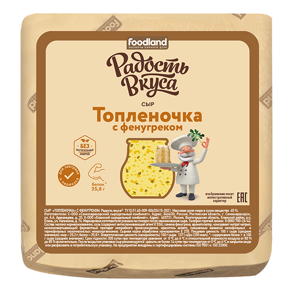 Сыр "Топленочка с фенугреком" ТМ Радость Вкуса- это уникальный продукт, который не оставит потребителя равнодушным. Его отличает деликатное сочетание сливочного вкуса топленого молока с добавлением пряного фенугрека. Сыр имеет нежную пластичную консистенцию и тонкий ореховый аромат. На срезе сыр привлекает внимание хаотично расположенными глазками неправильной формы и россыпью семян фенугрека, которые придают не только приятное ореховое послевкусие, а также содержат кладезь полезных витаминов и минералов, которые укрепляют иммунитет, благоприятно влияют на пищеварение и снижают уровень холестерина.
