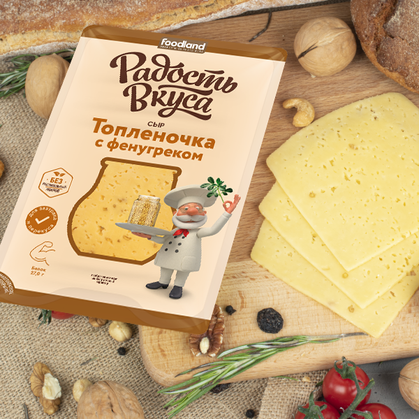 Сыр "Топленочка с фенугреком" ТМ Радость Вкуса- это уникальный продукт, который не оставит потребителя равнодушным. Его отличает деликатное сочетание сливочного вкуса топленого молока с добавлением пряного фенугрека. Сыр имеет нежную пластичную консистенцию и тонкий ореховый аромат. На срезе сыр привлекает внимание хаотично расположенными глазками неправильной формы и россыпью семян фенугрека, которые придают не только приятное ореховое послевкусие, а также содержат кладезь полезных витаминов и минералов, которые укрепляют иммунитет, благоприятно влияют на пищеварение и снижают уровень холестерина.
