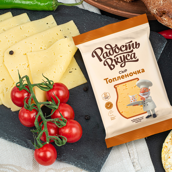Сыр Топленочка ТМ Радость Вкуса отличается нежным вкусом топленого молока, обладает насыщенным ароматом, имеет мелкий резной глазок.Идеально сочетается с фруктами, ягодами, орехами и медом.