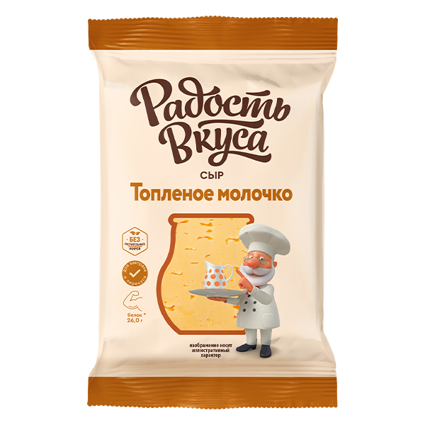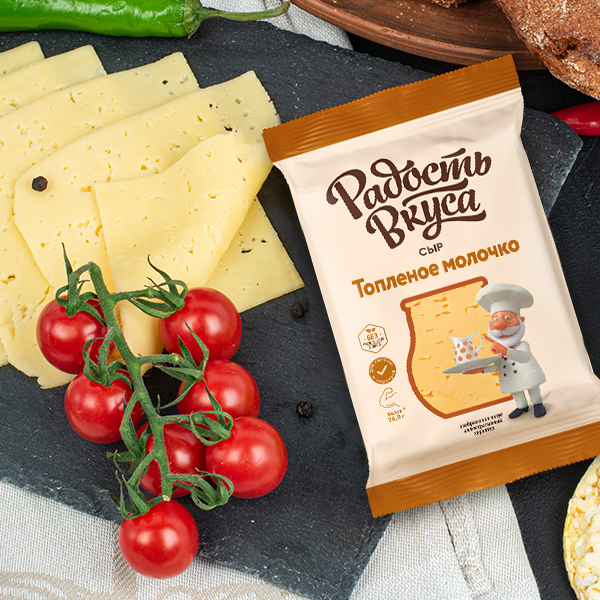 Сыр Топленое молочко ТМ Радость Вкуса отличается нежным вкусом топленого молока, обладает насыщенным ароматом, имеет мелкий резной глазок.Идеально сочетается с фруктами, ягодами, орехами и медом.