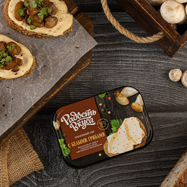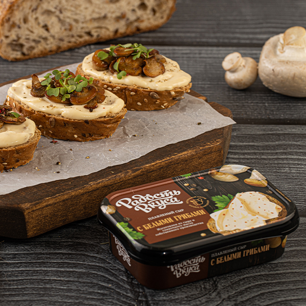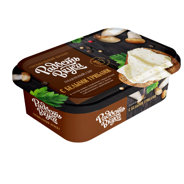 Плавленый сыр с белыми грибами - яркая новинка с уникальной рецептурой от ТМ Радость вкуса.Сыр сочетает в себе вкус нежнейших сливок и ароматных лесных грибов.