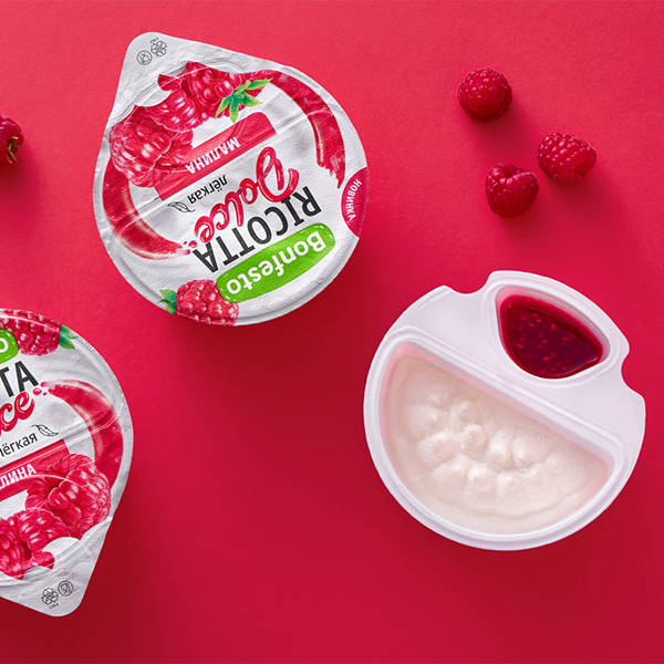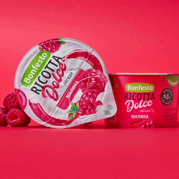 RicottaDolce - новая десертная рикотта с фруктово-ягодными наполнителями с жирностью в БЖУ на 40% меньше относительно ассортимента двухсекционной рикотты «Traditional Dessert».Отличается нежной, менее плотной текстурой в сравнении с текущим ассортиментом двухсекционной рикотты.