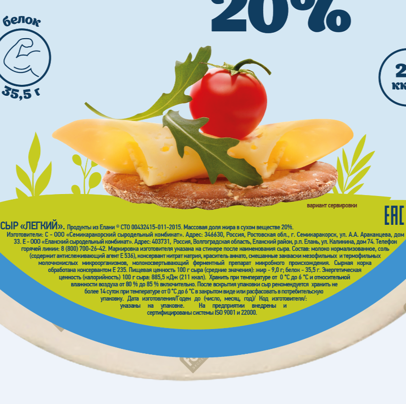СЫР «ЛЕГКИЙ». Продукты из Елани ® СТО 00432415-011-2015. Массовая доля жира в сухом веществе 20%. Изготовители: С - ООО «Семикаракорский сыродельный комбинат». Адрес: 346630, Россия, Ростовская обл., г. Семикаракорск, ул. А.А. Араканцева, дом 33. Е - 000 "Еланский сыродельный комбинат". Адрес: 403731, Россия, Волгоградская область, Еланский район, р.п. Елань, ул. Калинина, дом 74. Телефон горячей линии: 8 (800) 700-26-42. Маркировка изготовителя указана на стикере после наименования сыра. Состав: молоко нормализованное, соль (содержит антислеживающий агент Е 536), консервант нитрат натрия, краситель аннато, смешанные закваски мезофильных и термофильных молочнокислых микроорганизмов, молокосвертывающий ферментный препарат микробного происхождения. Сырная корка обработана консервантом Е 235. Пищевая ценность 100 г сыра (средние значения): жир - 9,0 г; белок - 35,5г. Энергетическая ценность (калорийность) 100 г сыра: 885,5 кДж (211 ккал). Хранить при температуре от 0°С до 6°С и относительной влажности воздуха от 80% до 85% включительно. После вскрытия упаковки сыр рекомендуется хранить не более 14 суток при температуре от 0°С до 6°С в закрытом виде или расфасовать в потребительскую упаковку. Дата изготовления/Годен до (число, месяц, год)/ Код изготовителя/: указаны на упаковке. На предприятии внедрены и сертифицированы системы ISO 9001 и 22000. Другие товары этой категории
