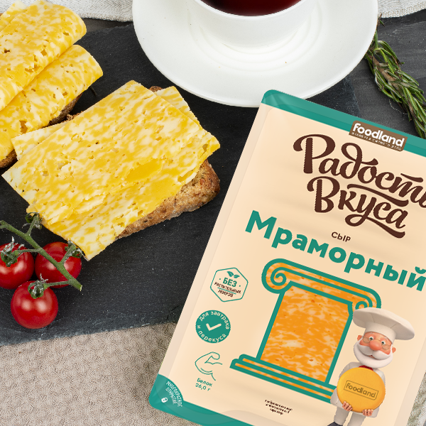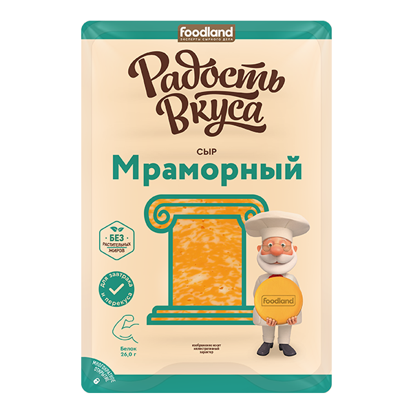 Мраморный сыр ТМ Радость Вкуса изготавливается из коровьего молока и выделяется среди прочих сыров необычным рисунком на срезе. Красивые разводы белого и оранжевого цвета изысканно переплетаются, напоминая мраморную текстуру.Сыр имеет нежный сладковатый вкус со сливочными нотками.