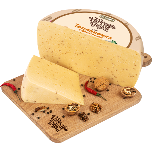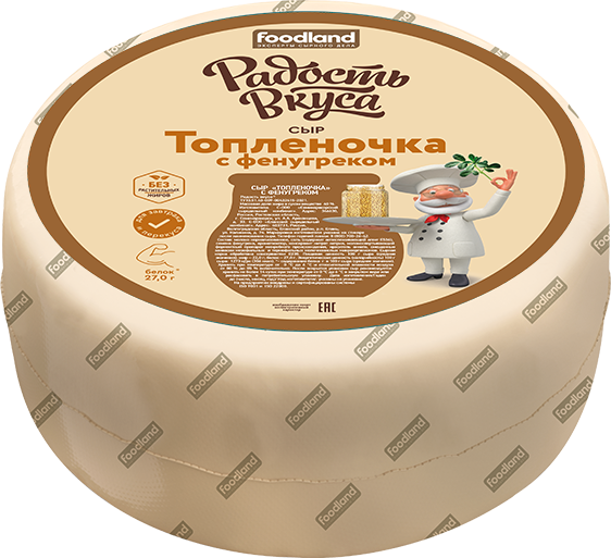 Сыр "Топленочка с фенугреком" ТМ Радость Вкуса- это уникальный продукт, который не оставит потребителя равнодушным. Его отличает деликатное сочетание сливочного вкуса топленого молока с добавлением пряного фенугрека. Сыр имеет нежную пластичную консистенцию и тонкий ореховый аромат. На срезе сыр привлекает внимание хаотично расположенными глазками неправильной формы и россыпью семян фенугрека, которые придают не только приятное ореховое послевкусие, а также содержат кладезь полезных витаминов и минералов, которые укрепляют иммунитет, благоприятно влияют на пищеварение и снижают уровень холестерина.