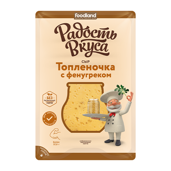 Сыр "Топленочка с фенугреком" ТМ Радость Вкуса- это уникальный продукт, который не оставит потребителя равнодушным. Его отличает деликатное сочетание сливочного вкуса топленого молока с добавлением пряного фенугрека. Сыр имеет нежную пластичную консистенцию и тонкий ореховый аромат. На срезе сыр привлекает внимание хаотично расположенными глазками неправильной формы и россыпью семян фенугрека, которые придают не только приятное ореховое послевкусие, а также содержат кладезь полезных витаминов и минералов, которые укрепляют иммунитет, благоприятно влияют на пищеварение и снижают уровень холестерина.