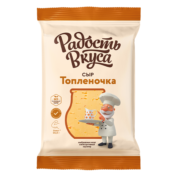 Сыр Топленочка ТМ Радость Вкуса отличается нежным вкусом топленого молока, обладает насыщенным ароматом, имеет мелкий резной глазок.Идеально сочетается с фруктами, ягодами, орехами и медом.